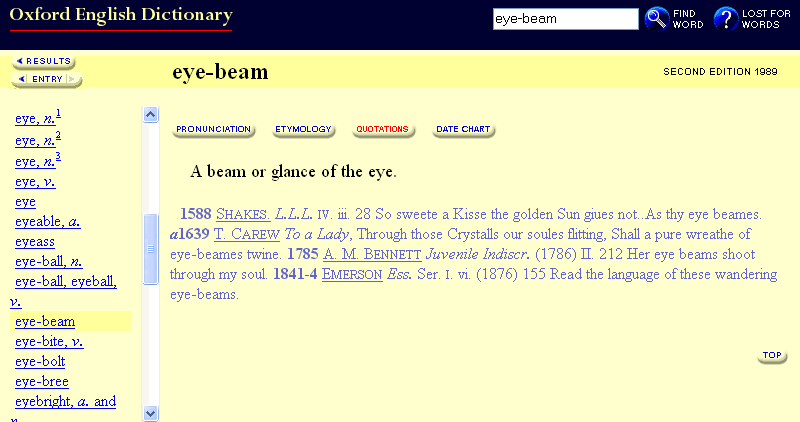 Some fans think that the アイ in the アイビーム approximates the English word eye because that combination of katakana characters usually does so. In that case, アイビーム approximates eye beam, eye-beam or even eyebeam. According to the Oxford English Dictionary, the best English dictionary out there, an eye-beam (or eye beam) is a beam or glance of the eye. The dictionary shows examples of quotations that use the spellings eye-beam and eye beam, but the main entry uses the spelling eye-beam. For that reason, this article will continue to use that spelling when referring to the idea that the アイ in アイビーム approximates eye.
