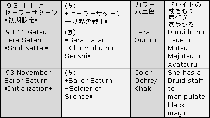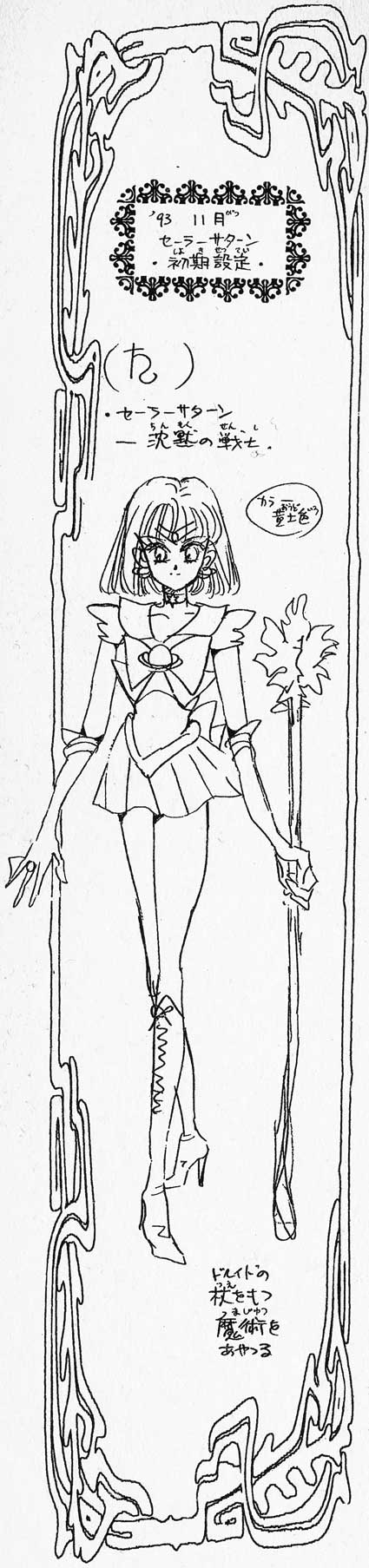 Volume nine of the original version of the Bish jo Senshi S r M n manga features an early image of Sailor Saturn by Naoko Takeuchi. This section features that image. It also features transliterations and translations of the text that appear on the image. Fans should notice the major differences between the Sailor Saturn in that image and the versions of Sailor Saturn that they already know of from the various continuities.