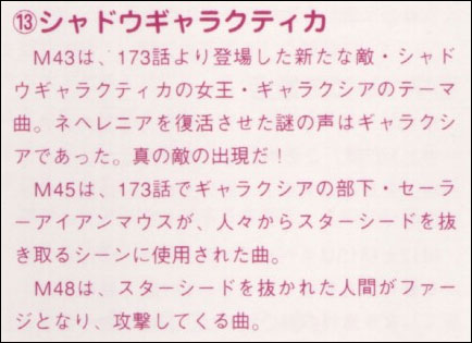 In the manga, Sailor Galaxia rules a horrific empire named the Shadow Galactica (meaning Shadow of the Galaxy or Galactic Shadow). Sailor Galaxia’s empire, in the anime and manga, consists of much of our galaxy. The anime itself does not mention the name Shadow Galactica, but the anime-relevant song named Golden Queen Galaxia does. The actress who sings the song, Mitsuko Horie, also plays the part of Sailor Galaxia in the anime. Naoko Takeuchi herself wrote the song, there is no indication that the song is relevant to the manga continuity. Ms. Takeuchi also wrote the lyrics for the song Route Venus, which only appears in the anime. So a song can relate to the anime even if Ms. Takeuchi wrote it. The Golden Queen Galaxia CD cover shows an anime image of Galaxia. Furthermore, Shadow Galactica is also the name of a piece of music that actually plays during the anime. The music’s description in the Sailor Stars Music Collection uses anime-specific information. (We are told that Sailor Galaxia is the queen of the Shadow Galactica.) It is not unreasonable to think that the musicians got their information from the animators themselves.