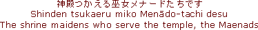 (NOTE: I have translated their name to be 'menaado;' however, I have no idea what this is a reference to. Some people believe it to be 'maenads' -- in Greek mythology, they were mad and frenzied female companions of Dionysus who tore apart wild beasts with their bare hands.