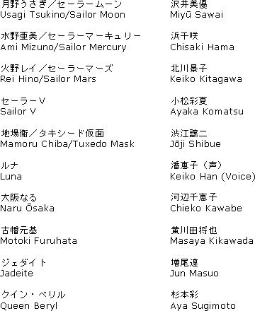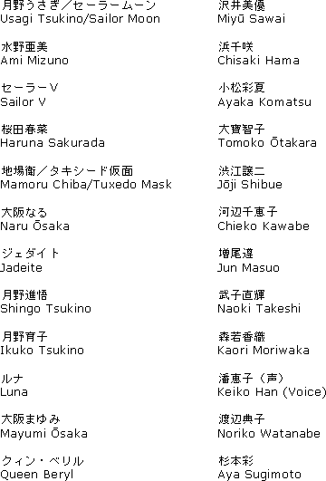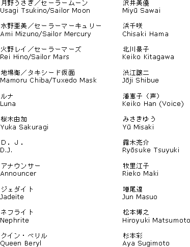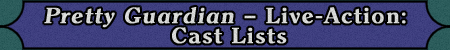 This section contains cast lists for the first twelve acts of the live-action “Pretty Guardian Sailormoon” television show. Macavity, SailorJupiter244, and the owner of the Bish