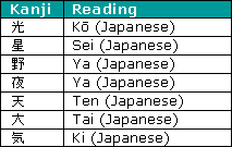 The Three Lights may not really be from Japan, but their names are Japanese:  (Seiya’s full name),  (Yaten’s full name),  (Taiki’s full name). The kanji is read as k only in Japanese. The kanji is read as sei only in Japanese. The kanji is read as tai only in Japanese. All of the kanji in their names are supposed to have Japanese readings. Here is a chart of the kanji and their readings: