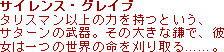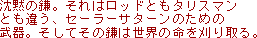 Said to have greater power than any of the talismans, it is Saturn's weapon. With this giant scythe, she will reap this world's life…….