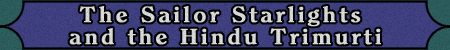 Kotetsu has a section in her Web site Starlight Pops in which the mythology and symbolism pertaining to the Sailor Starlights are discussed. That section contains two large sections that attempt to associate the Hindu Trimurti with the Sailor Starlights: The Hindu Trimurti and Evidence to Support the Trimurti Association. The idea is said to be “just a theory,” and it seems that Kotetsu had the everyday definition of the term theory rather than the scientific definition. So the term is in this case is used to describe an educated guess. I have read the evidence several times and I still do not believe that the connections are strong. Although one could take the time to respond to all of the arguments in favor of the connections, it would be more appropriate to criticize the main ideas.