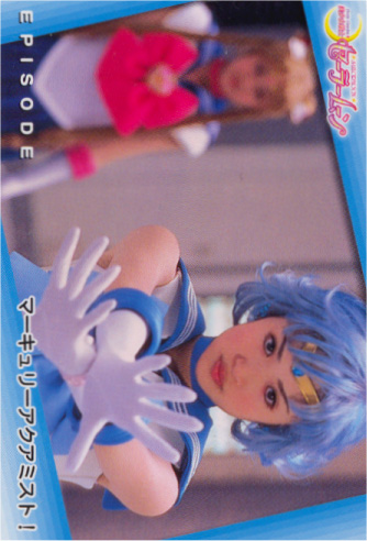 Some of the early synopses of the live-action series claim that Mercury Aqua Beam is one of Sailor Mercury’s maneuvers in that continuity. Sailor Mercury performs Mercury Aqua Mist in the new version of the manga, so fans began to think that the maneuver that was referred to as Mercury Aqua Beam actually has the name Mercury Aqua Mist. One of the new cards that pertain to the live-action series shows the katakana-character combination for Mercury Aqua Mist:   M kyur Akua Misuto. The card was scanned by the owner of Three-Lights.net.
